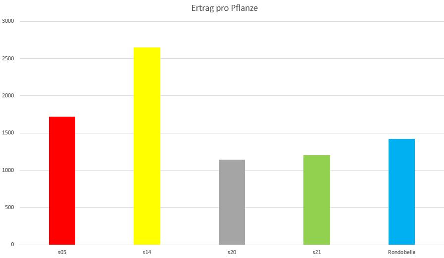 Der Ertrag von S21 blieb etwas hinter der Referenzsorte zurück, obwohl es sich um eine relativ großfruchtige Sorte handelt. Vielleicht spielte hier das sehr dichte Laub und das kräftige Wachstum von Geiztrieben eine Rolle. Im Standardanbau hätte hier durch das Entfernen überzähliger Blätter eine bessere Reife der Früchte erzielt werden können.