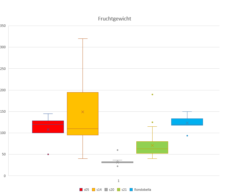 Interessant ist auch ein Blick auf das Fruchtgewicht, im nächsten Diagramm als Boxplot dargestellt. Die Box zeigt dabei die Verteilung der mittleren 50%, im Bereich darunter und darüber das untere bzw. obere Quartil mit jeweils 25%. Sehr schön ist hier im Vergleich zur Referenzsorte die teils sehr breite Streuung der Fruchtgewichte zu sehen, die für marktfähige Sorten nicht wünschenswert ist. Für den Hobbygärtner ist die gleichmäßige Fruchtgröße gegenüber Eigenschaften wie Geschmack, Robustheit und Ertrag sicher weniger wichtig.