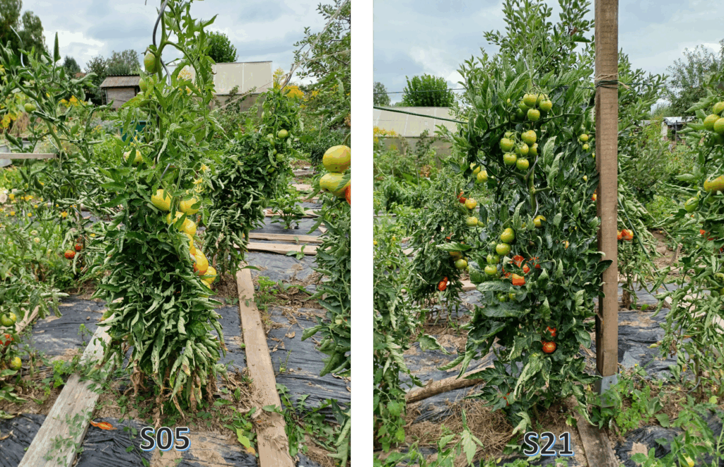 Bis Anfang Juli verlief bei allen Sortenkandidaten, der Referenzsorte „Rondobella“ sowie den Randpflanzen unbekannter Sorte das Wachstum sehr gut und und ohne Anzeichen von Krankheiten. Ab Mitte Juli war dann zuerst bei den Randpflanzen und wenig später bei S05 ein leichter Krautfäulebefall zu erkennen. Bei S05 beschränkte sich der Befall auf die unteren Blätter und breitete sich bis zum Ende des Anbauversuchs nicht weiter als bis zum ersten Drittel der Pflanzenhöhe aus. Die Früchte von S05 waren nicht betroffen. Dagegen war bei den Randpflanzen ab Mitte August nahezu jede Frucht von Krautfäule betroffen und damit unbrauchbar.