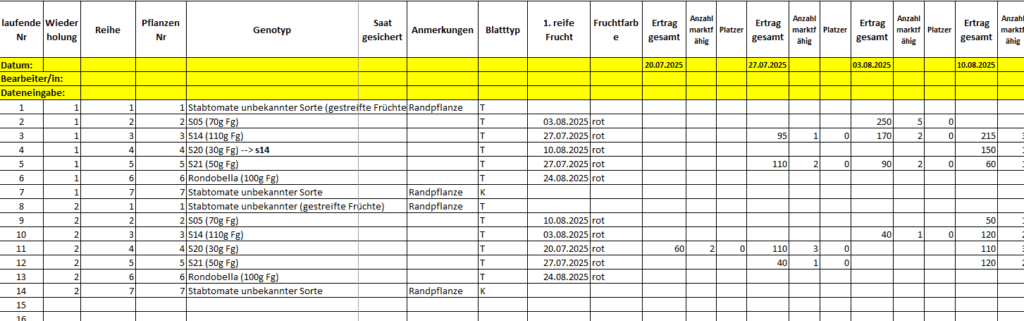 Zur Erfassung der Ergebnisse wurde das sogenannte Fieldbook genutzt, eine von der Universität Kassel zur Verfügung gestellte Tabelle. Neben der wöchentlichen Ernte wurde hier auch die Pflanzengesundheit dokumentiert. Dazu wurde Ende Juli und Anfang September jede Pflanze im Detail auf Befall mit Krautfäule oder Dürrfleckenkrankheit sowie generell auf Krankheitssymptome untersucht.